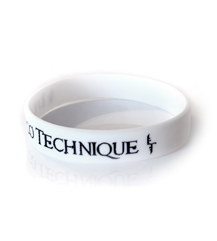 White silicone wristband with black Ludovico Technique text and logo
